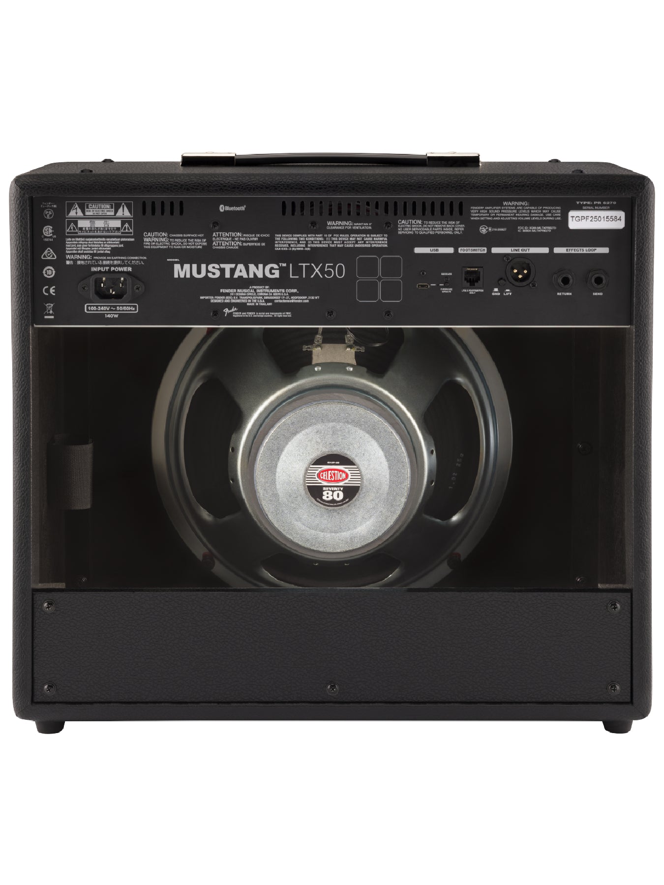 Mustang LTX 50 is ideal for practice or performance with a 12" Celestion G12P-80 speaker and an optional gig-ready 5-button footswitch. Onboard Bluetooth allows you to jam along with your favorite songs as well as create, edit, download and share presets using the Fender TONE app.